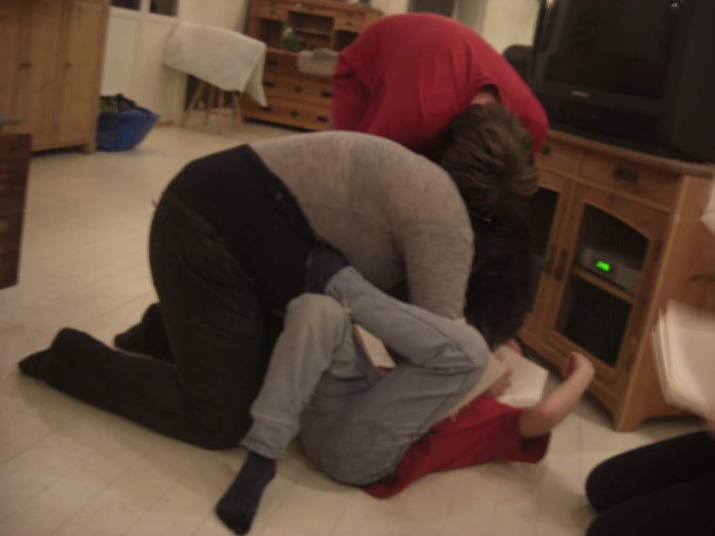 Barn och familj: Har umgåtts riktigt inensivt med barnen i veckan. Lekar (se bilden; "lappleken" inbjuder till div gymnastiska och ledbrytande öveningar), teaterkafé med Frejas klass (ett litet smakprov får du om du klickar på bilden av henne - med illa dold modersstolthet måste jag ju säga att hon gjorde en strålande insats medan andras memoreringsförmåga vida översteg inlevelseförmågan...), julbord med släkten (då blev vi så mätta att jag inte orkade lyfta upp kameran men det finns vittnen på att Fredrik åt 17 ägghalvor...i år också...) och i kväll kommer Fredriks son på efterlängtat helgbesök.