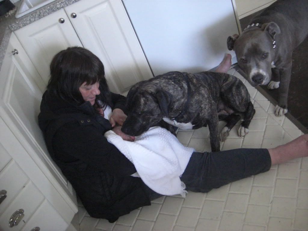 Efter kontroll av barnläkare kl 9 i dag på morgonen fick vi åka hem. Så skönt. Där välkomnades vi av två hundar som förundrades över den nya människovalpen. Särskilt Fella tog från första sekund sin nya roll på fullaste ansvar; satte sig tätt, tätt intill lillebror och har sedan dess inte vikit från hans sida. Och närhelst hon kommer åt tvättar hon honom varsamt.